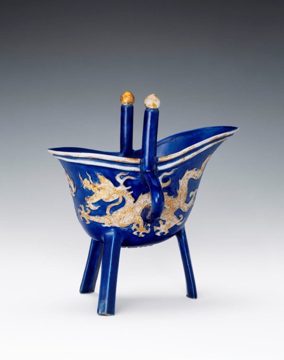 After the form of the archaic bronze jue, helmet shaped, with two vertical knobbed posts rising from the rim, a side loop-handle, and three slender legs. Striding five-clawed dragons moulded in relief on either side dispute a flaming pearl; at the other end is a cloud motive. The designs, post finials and two ribs encircling the rim are left in unglazed biscuit and picked out in gilt, on a ground of deep violet-blue glaze. The six-character reign mark appears in moulded relief on the underside, picked out in gilt.