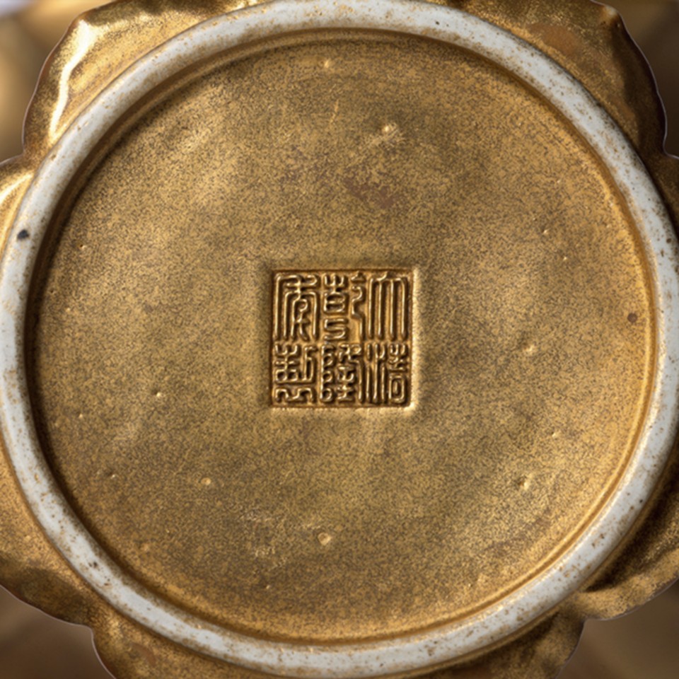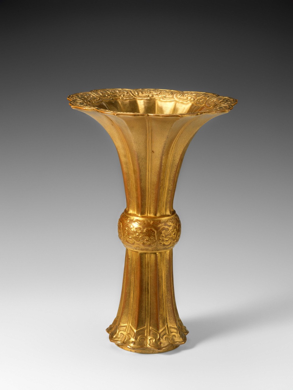 In gu beaker form with slender body interrupted by a rounded central boss, the sides shaped in nine angular lobes and spreading trumpet-like to the foliated rim, whilée spreading also towards a similar foliated projection at the foot; with inset foot ring and flat base. The central boss is decrated with five conventionalised bats in relief and the inside of the lip with a design of nine pointed ruyi heads containing bats. The vase is covered with soufflé gilding which is applied over a brownish-aubergine enamel. Within the neck are visible imitation clips of a kind used in joining the upper and lower halves of such a bronze vessel.