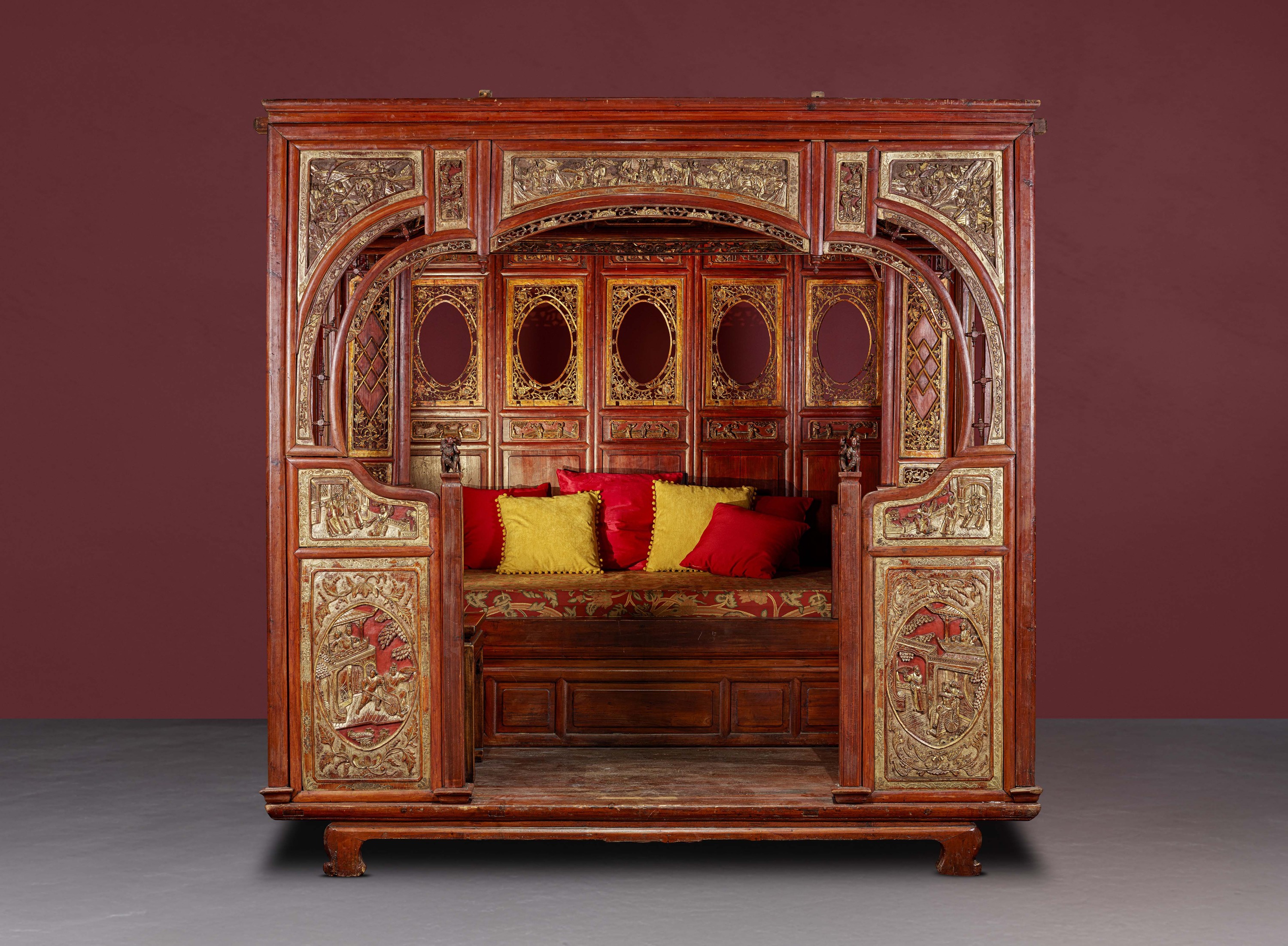 Den Auftakt des zweiten Teils der Ausstellung bildet ein wunderschönes Ehebett aus geschnitztem und vergoldetem Holz, das ein Symbol für diesen wesentlichen Lebensabschnitt darstellt. In einer jahrhundertealten patriarchalischen Gesellschaft gibt es viele dekorative Motive, die auf das Eheglück, den Wunsch nach Fruchtbarkeit und das Verlangen nach männlichen Nachkommen verweisen. Die Literatur spiegelt vielfach die Bedeutung der Ehe wider, ob sie nun als Zwang oder als glückliche Verbindung erlebt wird, wie etwa in der berühmten Erzählung vom Westzimmer (Xixiang ji 西廂記), die oftmals auf Keramiken abgebildet ist.