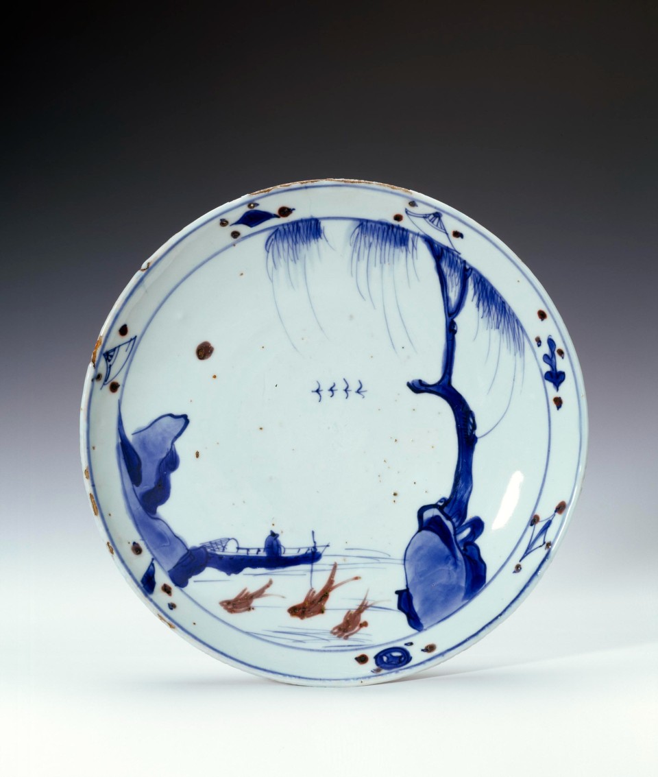 Of saucer shape with curving rim; low foot. Painted inside with a fisherman in a boat under a willow, and three swimming fish in copper-red, surrounded by a border with seven auspicious objetcts. The glaze has gritty imperfections, and grit adheres to the foot.