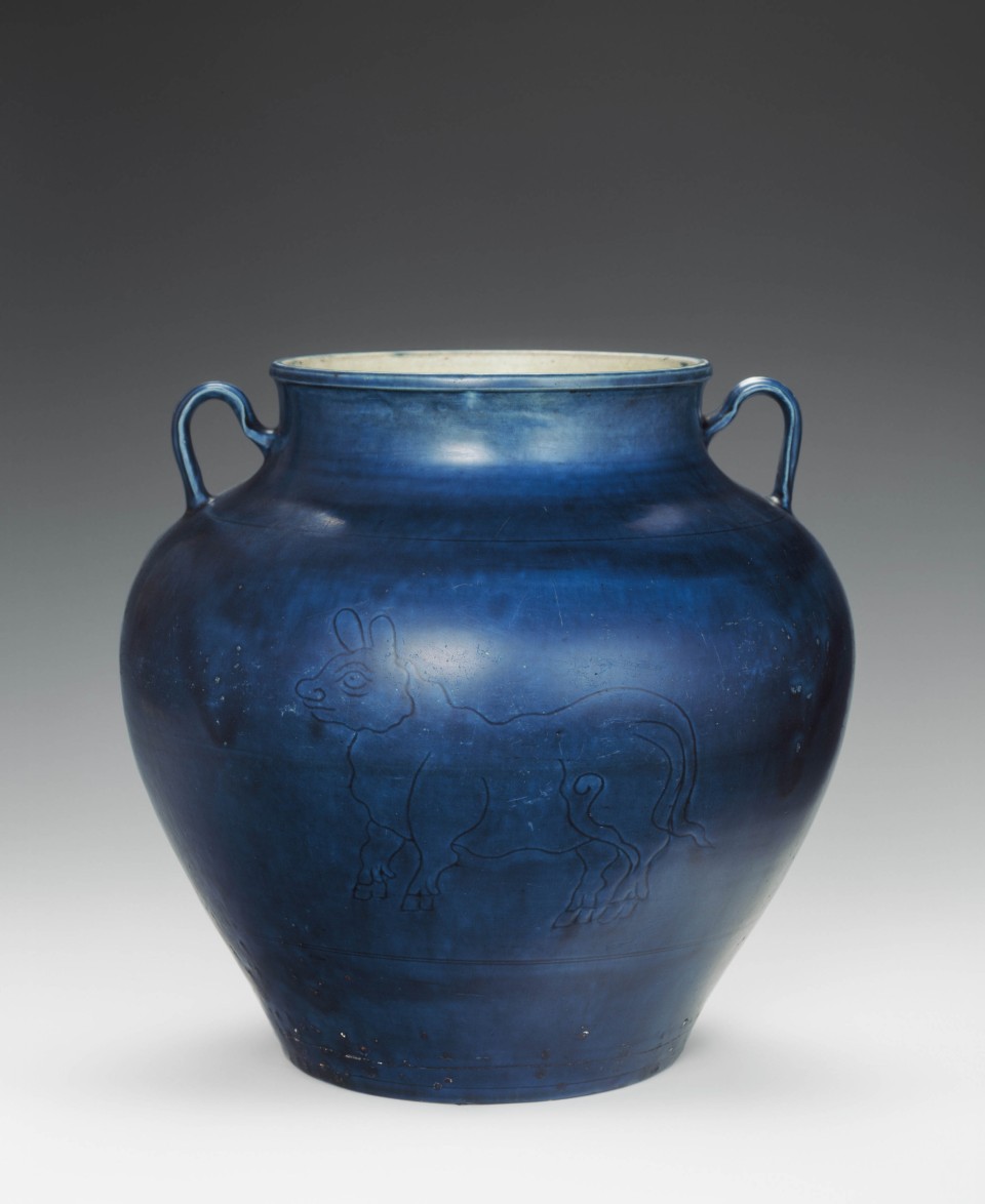 A potiche with two braided loop handles set on the tapering neck, and projecting lip; convex, glazed base. The exterior is covered with an uneven blue glaze of rather indigo tint; the inside is plain. On either side within a broad encircling band appear incised designs of an animal with body and feet resembling those of an ox, but having large, rounded ears. The six-character mark is written in underglaze blue.