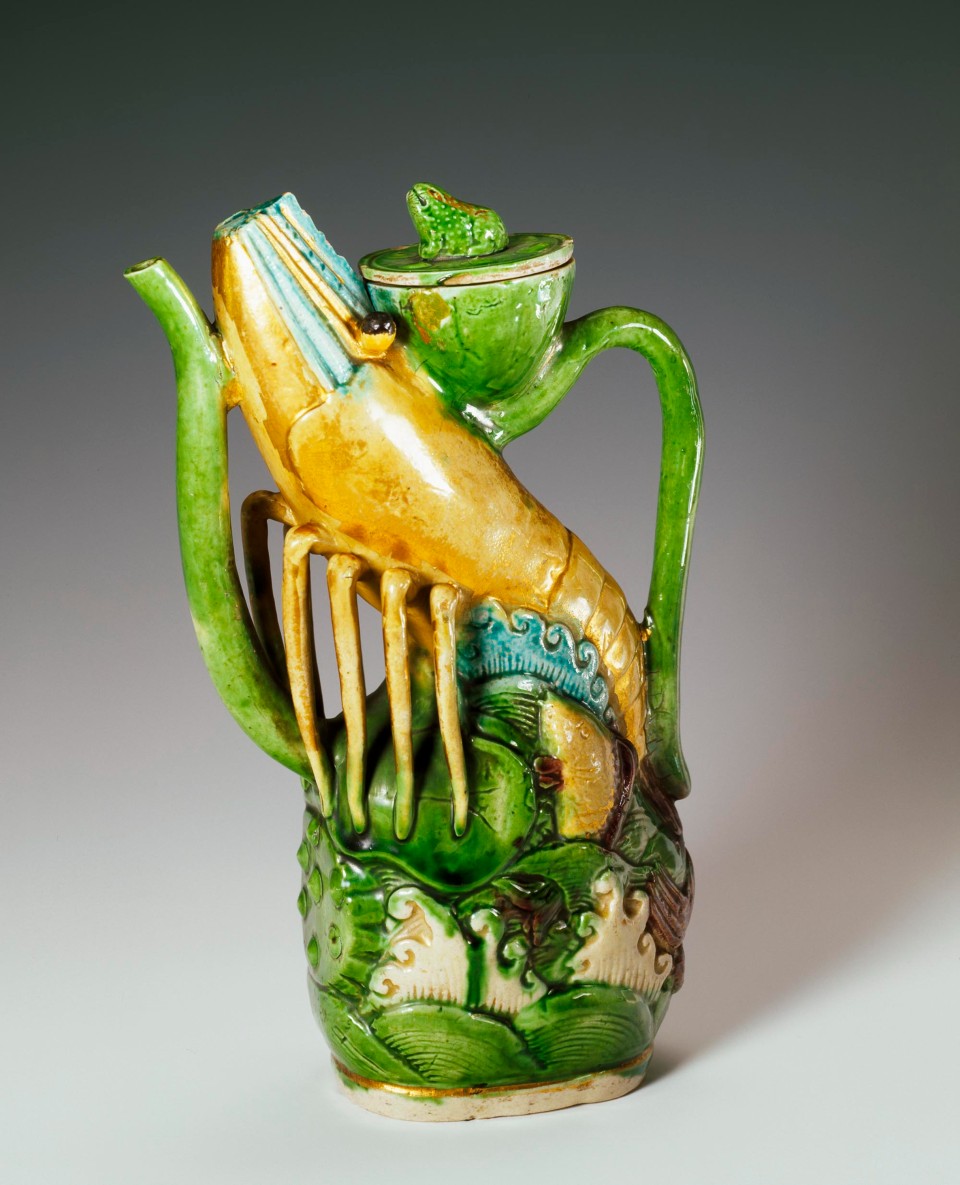 L'écrevisse est perchée sur une feuille de lotus inversée, dont la tige forme un bec verseur ; sur son dos se trouve un godet en forme de lotus avec un couvercle plat surmonté d'une grenouille, et une tige constituant l'anse. La partie inférieure est moulée avec un motif de vagues déferlantes et une carpe sautant de chaque côté, ainsi qu'un crabe sous l'anse. La pièce est décorée de glaçures vertes, jaunes, turquoises et aubergines, les zones à glaçure jaune étant dorées à la feuille. La base ovale en creux n'est pas émaillée.