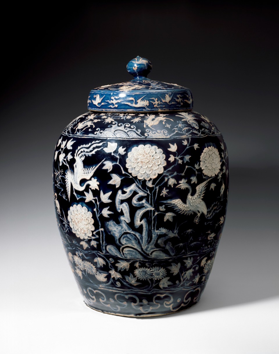 Sur une glaçure d’un bleu violacé profond, décor d’engobe blanc rosé où apparaissent quelques traces de dorures. Sur la panse, des phénix se posent parmi des rochers et des pivoines en fleurs, ainsi que des grues au milieu de lotus et bambous. Sur l’épaule, des chevaux marins et des licornes qilin 麒麟 galopent parmi des vagues. Sur le couvercle, quatre lions bouddhiques jouent avec des balles brodées.