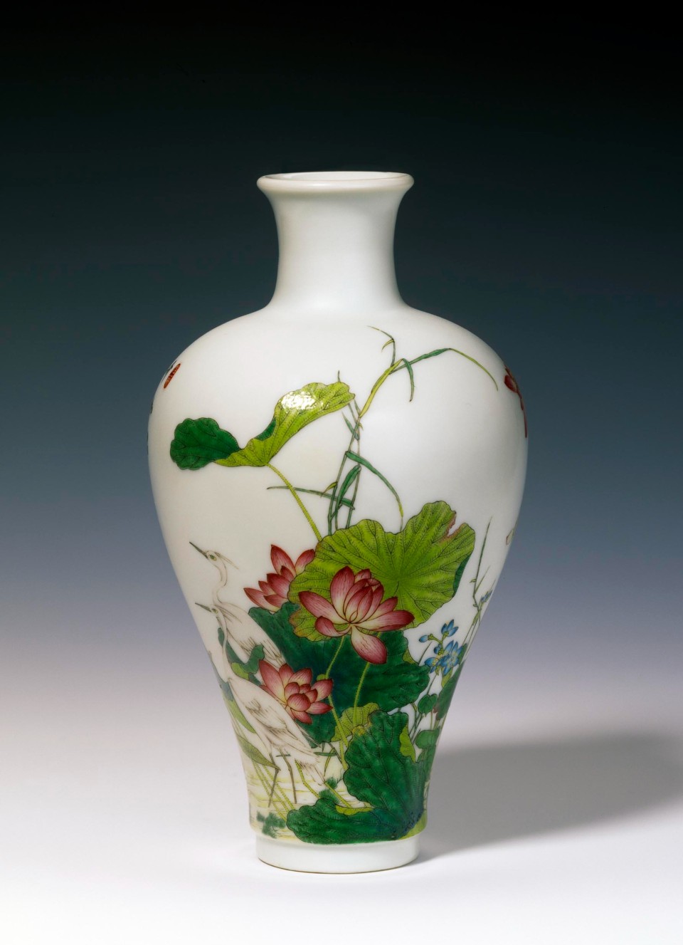 Of so-called meiping form with rounded shoulder and sides tapering to the small foot which is inset, the short neck expanding towards the lip. Painted round the outside with dominant tones of green and crimson-pink is a design of three white herons among growing lotus, reeds and other water-plants, also a two-line poem that reads: "jie ru jun zi de, yun si meiren zhuang 介如君子德,韻似美人粧 ". Whole as the virtue of a sage, varied in nuance as the beauty's dress; preceded and followed by seals in iron-red "jiali 佳麗" (Fine and elegant), "cui pu 翠鋪" (kingfisher nest), and "xia ying 霞映" (sunlit radiance).