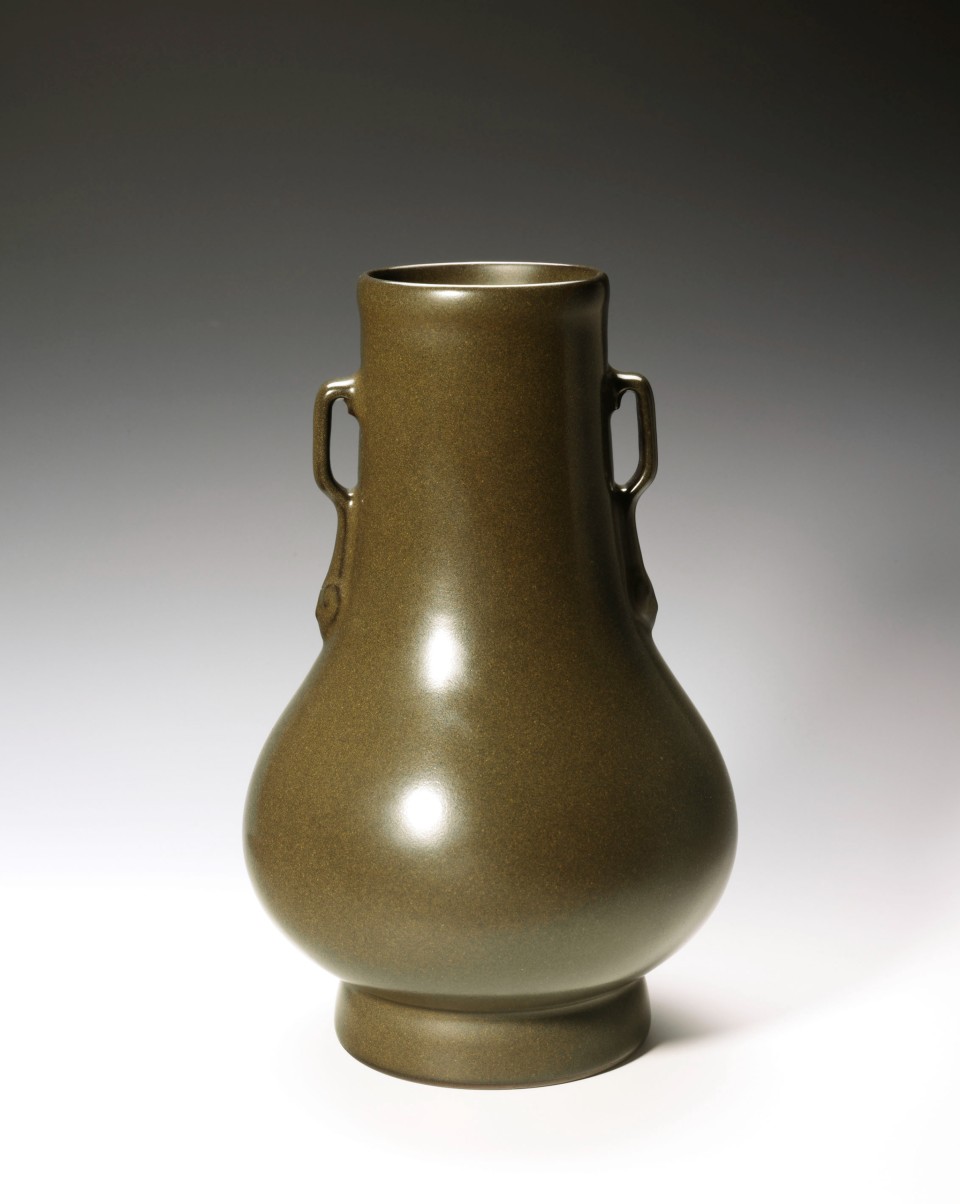 Pear-shaped, with broad cylindrical neck and gently rounded mouth rim, having a pair of rectangular, flat loop handles with pendant ruyi heads in moulded relief on the sides; rather high, spreading foot. The vase is covered with an opaque, dark olive-green glaze with minute flecks of a lighter colour.