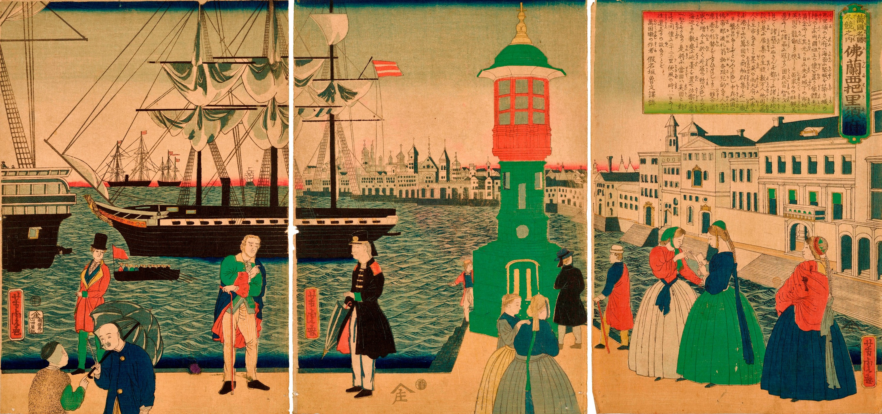 Toutes ces œuvres ont été réalisées entre 1860 et 1890, trois décennies correspondant aux dernières années de l’époque d’Edo 江戸 (1603-1868) et au début de l’ère Meiji 明治 (1868-1912), une période cruciale de l’histoire du Japon moderne qui voit de profonds changements politiques et sociétaux amenés entre autres par l’ouverture du pays aux idées et aux technologies venues de l’Occident. Le premier volet, les images dites « de Yokohama » (Yokohama-e 横浜絵), illustre la phase initiale de cet échange, celle de la rencontre avec l’Autre, marquée surtout par la curiosité. Le deuxième volet, les hashika-e 麻疹絵 (« images de rougeole ») reflète les espoirs et les craintes ressenties par la population face à une épidémie meurtrière en 1862. L’exposition se termine avec une présentation du grand dessinateur Tsukioka Yoshitoshi 月岡芳年 (1839-1892), dont la carrière professionnelle se situe précisément entre 1863 et 1892 : profondément attaché à l’histoire et aux valeurs de son pays, il est également un artiste innovateur et créatif.